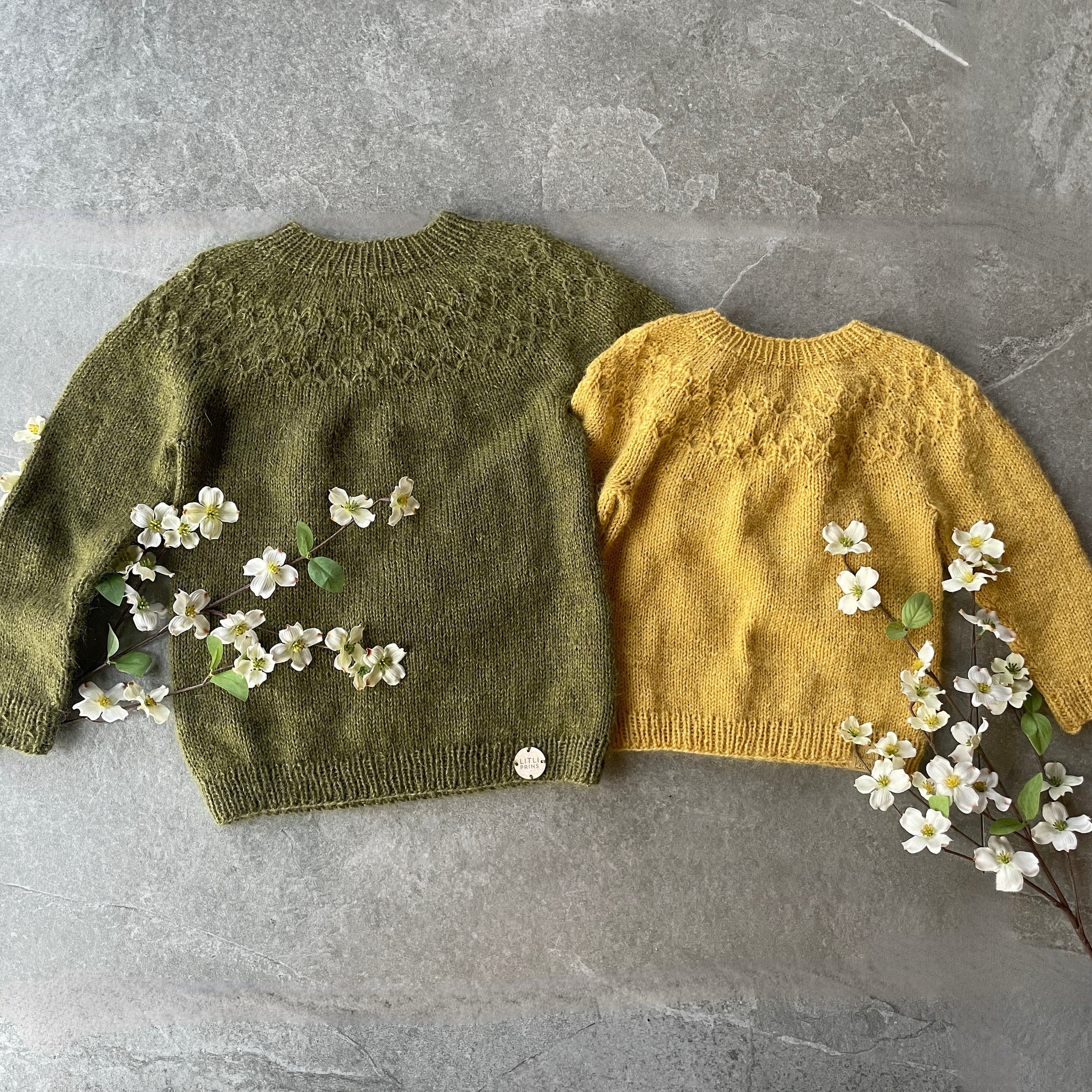 Þessi peysa er með fallegu mynstri í berustykkinu en slétt að öðru leyti.